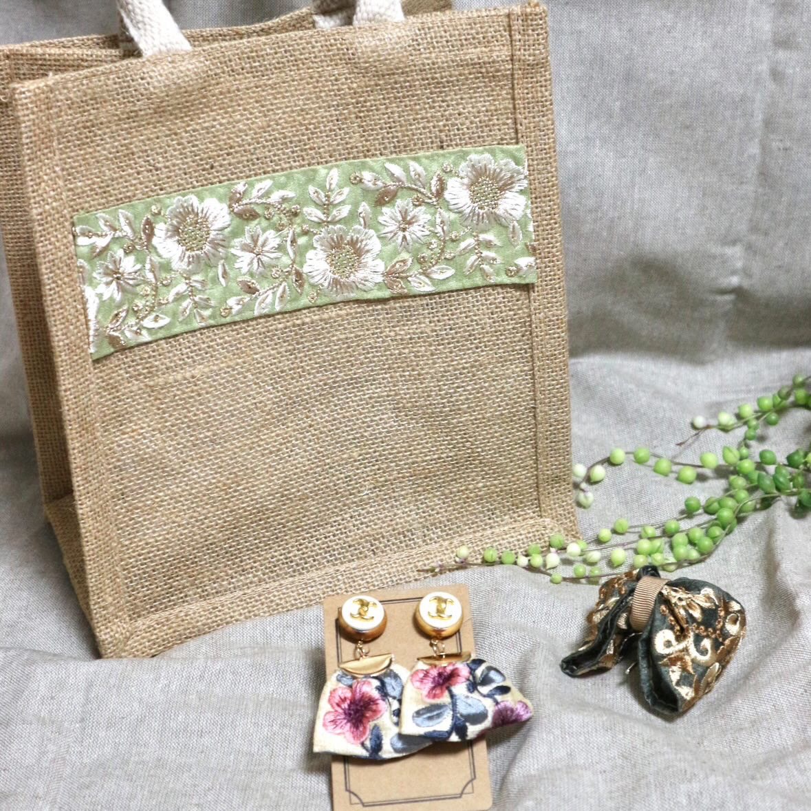 大人かわいいインド刺繍リボンを施したアクセサリーや、ジュートバッグをご用意。毎日のコーディネートを彩る一点物に出会えます。