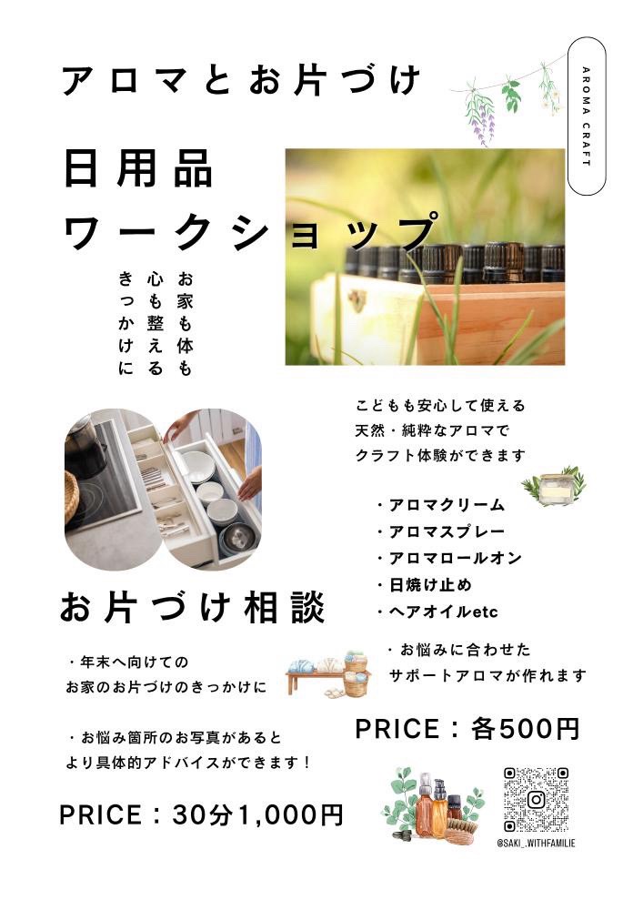 身体に優しいナチュラルな日用品を、天然で純粋なアロマで作るワークショップや、お片づけ相談を実施。アロマクリーム、アロマスプレー、お片づけ相談(30分 1,000円)など、**各500円〜**体験できます。年末に向けて、お家も心も整えるきっかけ作りにぴったりです。