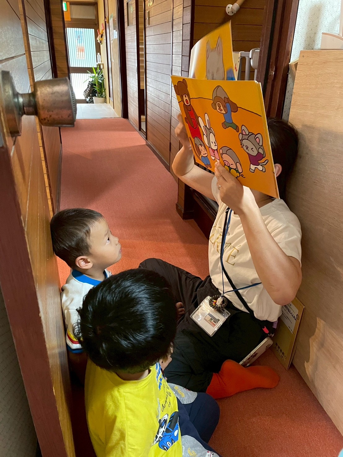 訓練の導入として、今回も未就学児のお子さんにもわかりやすい紙芝居を使って、地震や火事の怖さ、そして「もしも」の時の行動について楽しくおさらいしました。