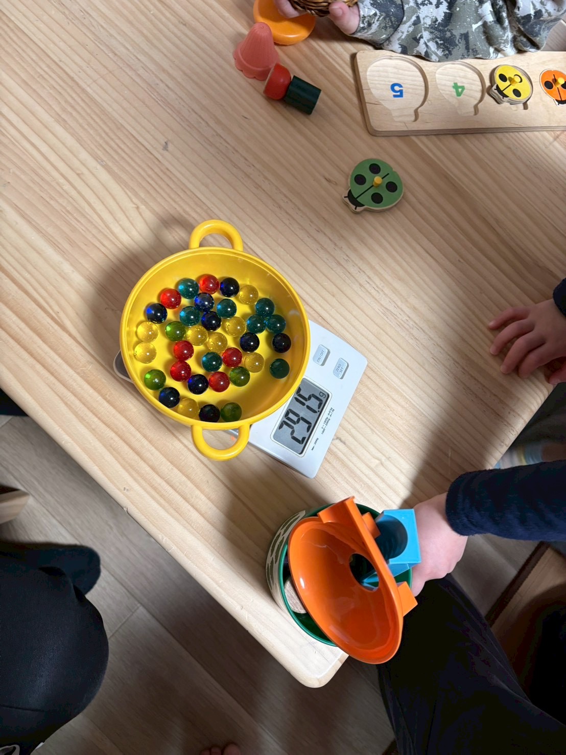 この遊びは、算数のような「数」の学習であると同時に、自分の手の感覚を研ぎ澄ます「感覚遊び」でもあります。 「300グラム」という目標に向かって集中し、ピッタリ賞が出た時の達成感は、子どもたちの大きな自信につながったようです。