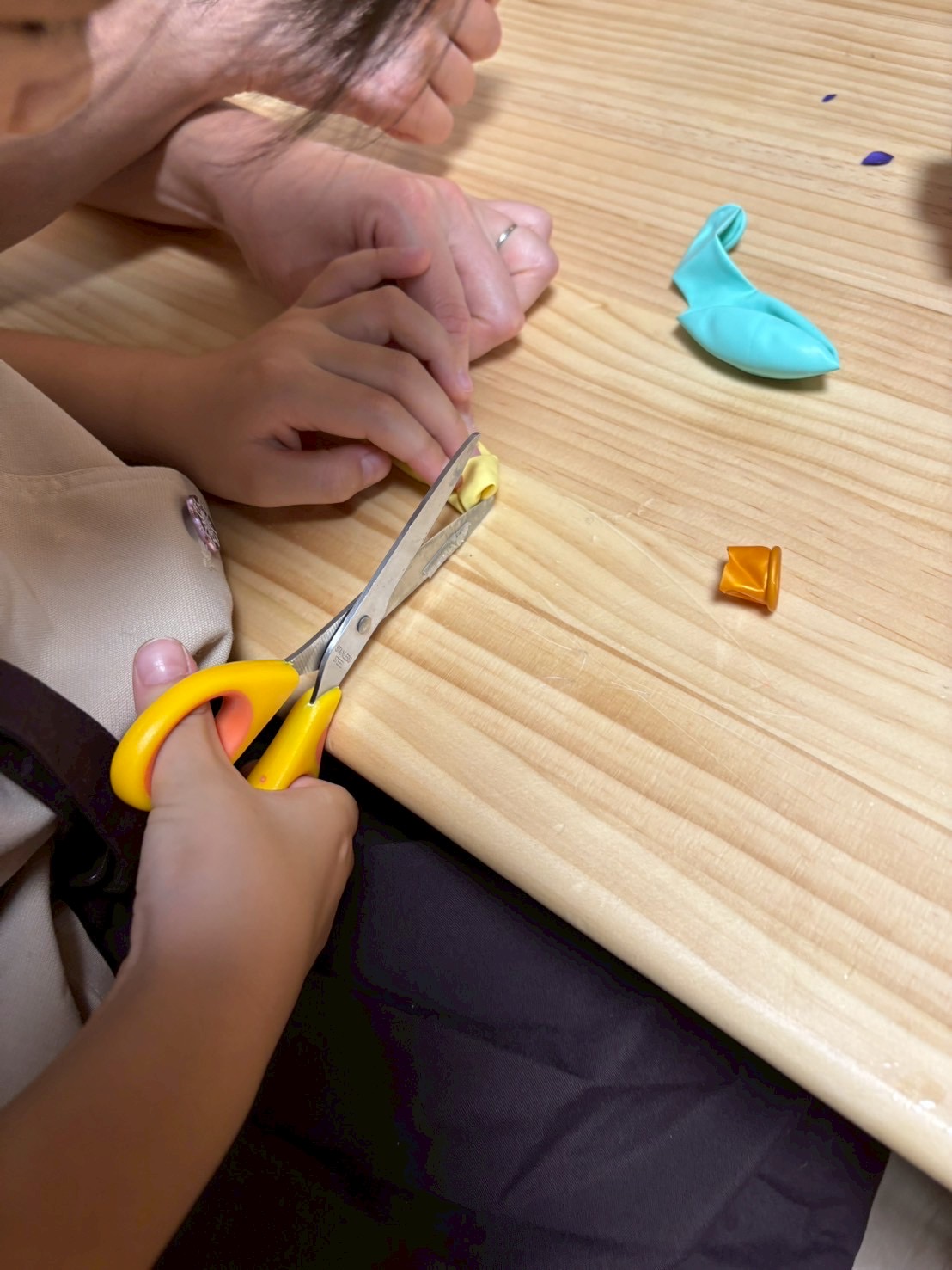 子どもたちはワクワクしながら、ハサミを手にします。風船を切ると、中から水が飛び出したり、風船の形が変わったり…と、予想外の発見がありました!🤩 この「自分で試してみる」という行動が、「どうしてかな?」と考える力を育みます。🤔