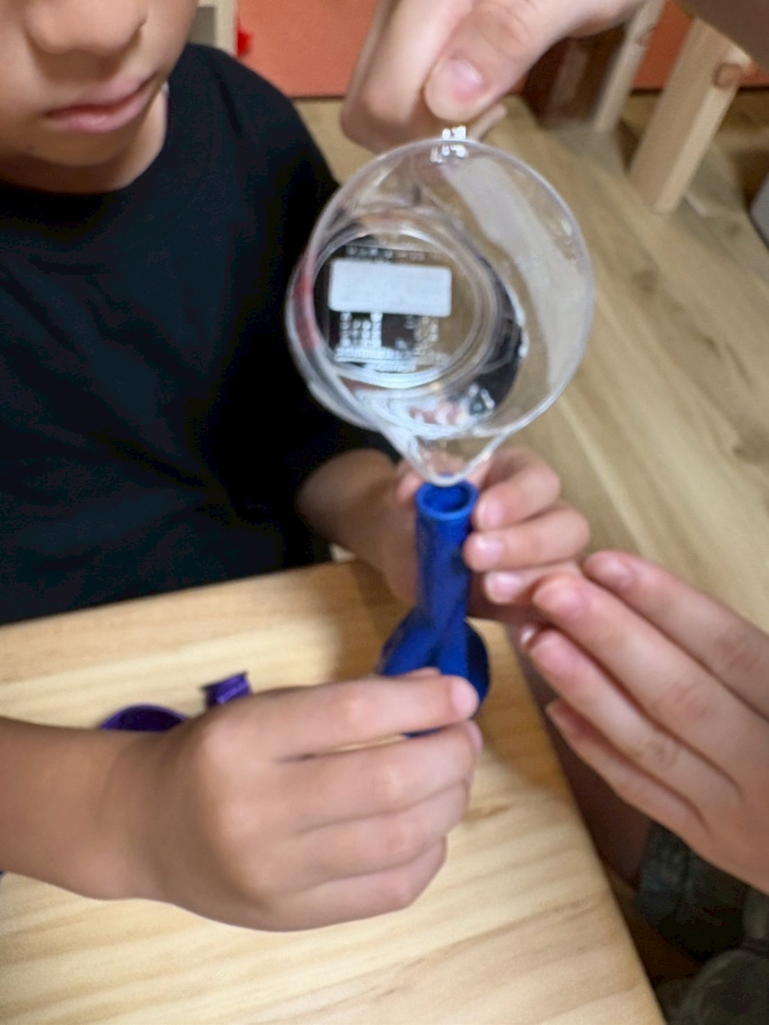 風船に水が溜まっていくにつれて、だんだん重く、そして形が変わっていく不思議な感触に、子どもたちは興味津々。👀 この「見て、触って、感じる」という体験は、子どもたちの探究心をくすぐります。💡