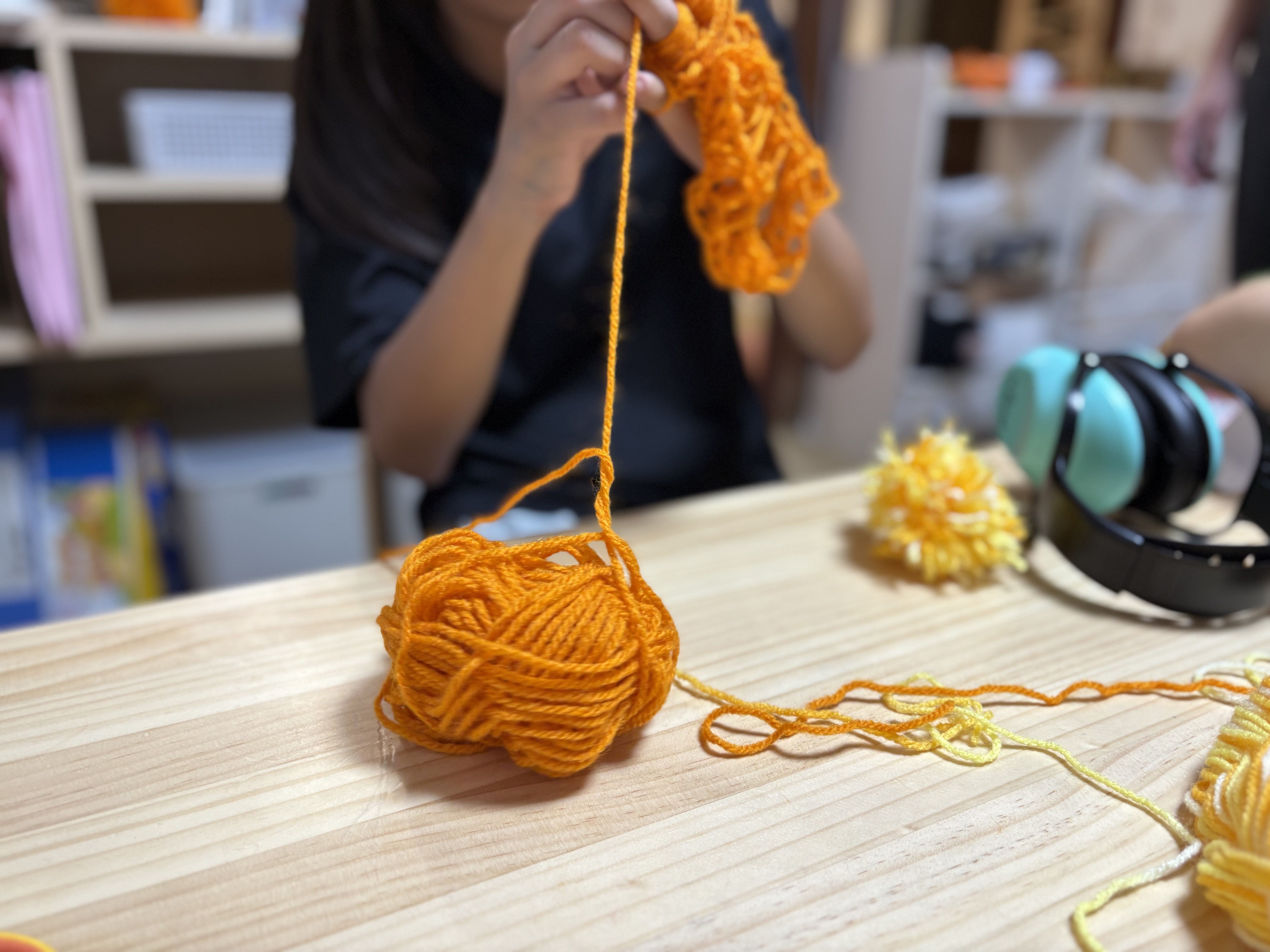 この日のメインは、オレンジ🍊や黄色🟡、白⚪️などのハロウィンカラーの毛糸を使ったボンボン作り!