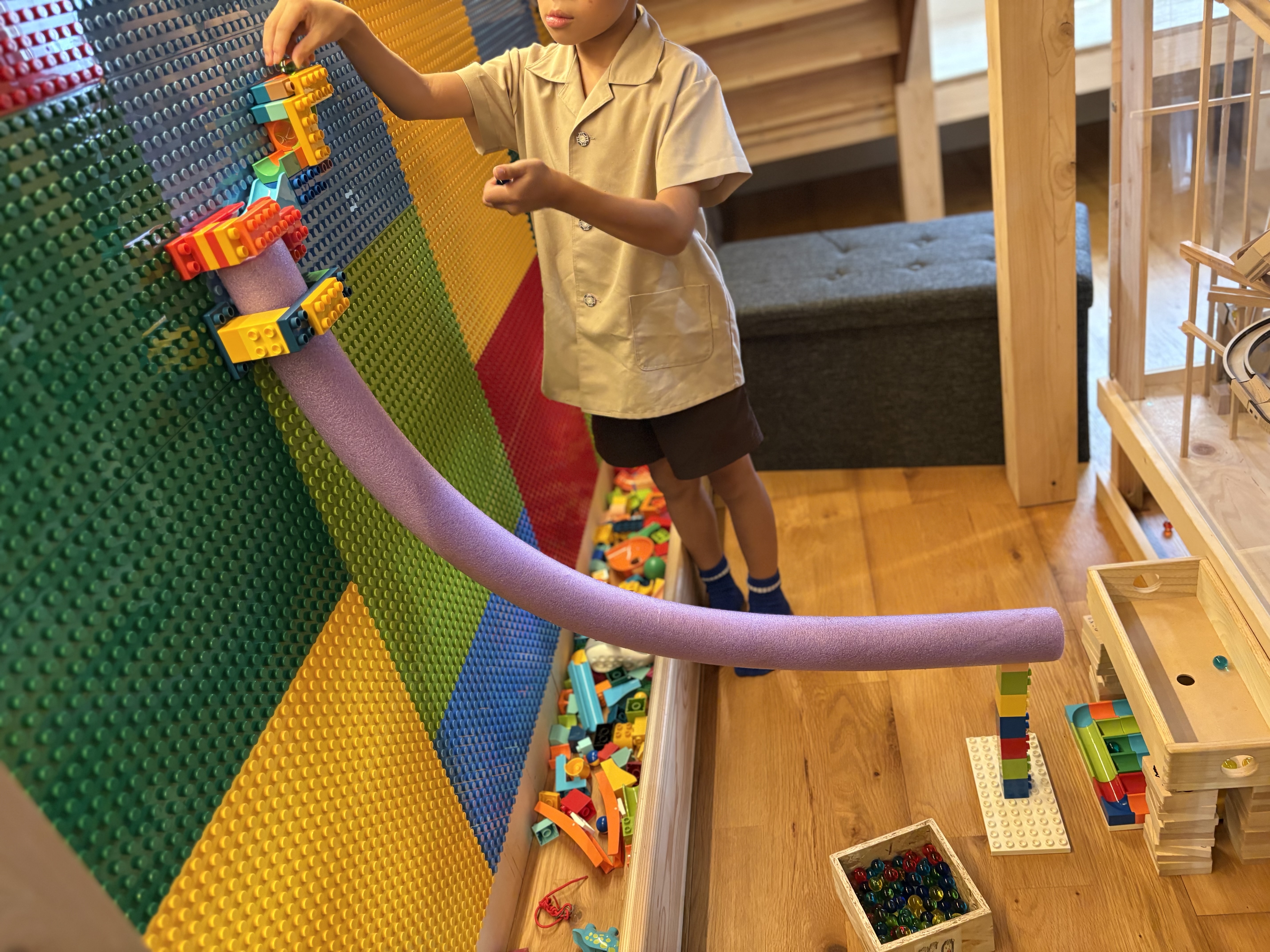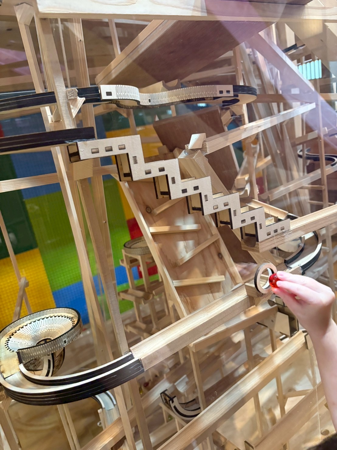 • レゴブロックの壁: 近くの壁にはカラフルなレゴブロックがあり、レールのようなパーツを使って、木製のマーブルランから流れてきたビー玉を受け継ぐコースを自分で作り出すことができます。