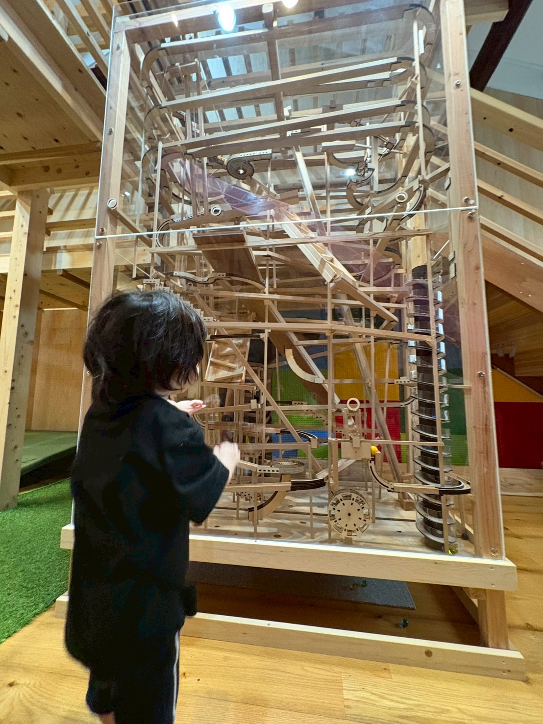 当施設のシンボルでもある**「巨大な木製マーブルラン」。ただ遊ぶだけでなく、実はこの遊具には「見る力」や「挑戦する心」**を育む、たくさんの秘密が隠されているんです!