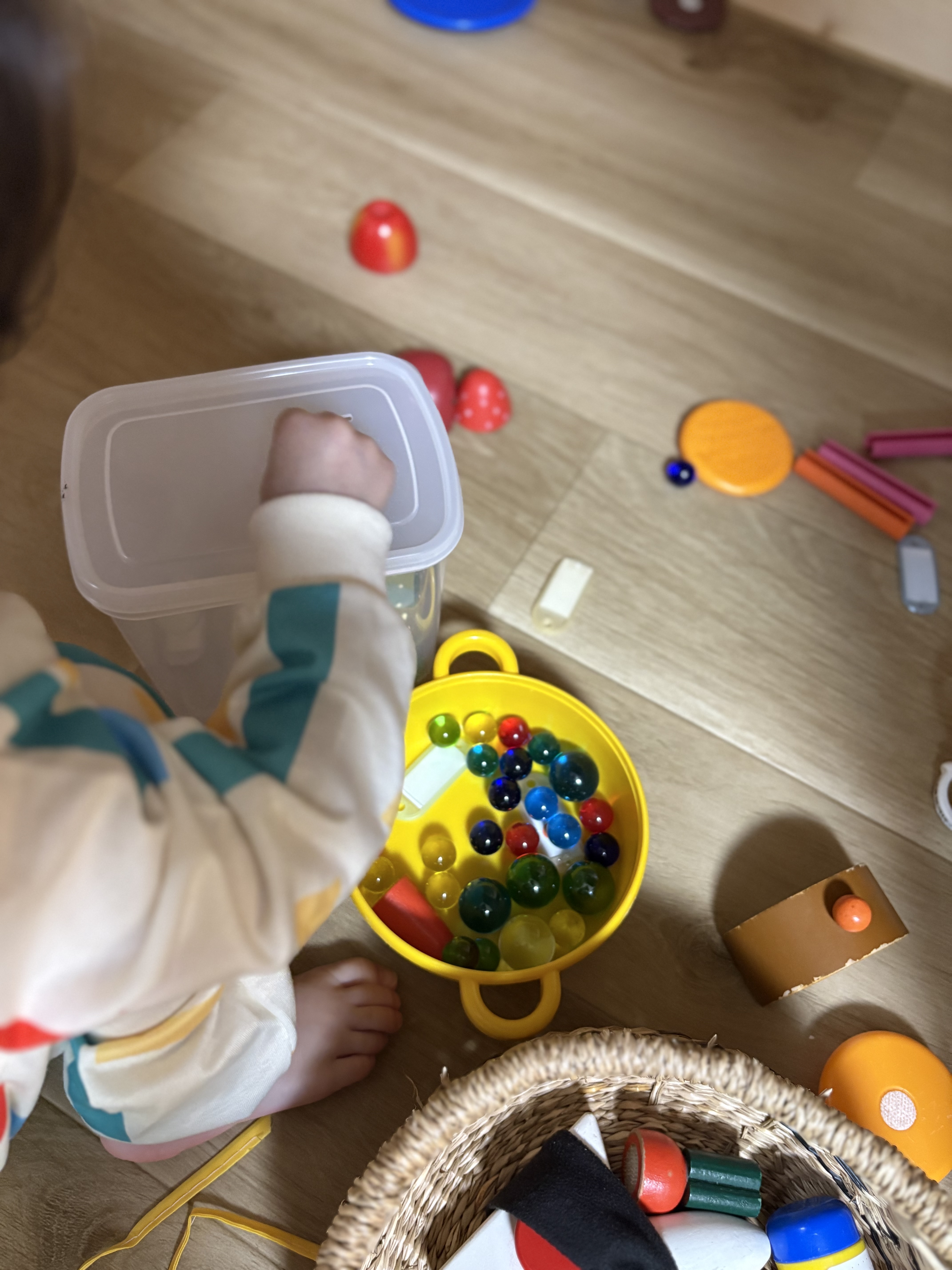 カラフルなビー玉🔴🟢🟡を、小さな手で一つひとつ持ち上げ、手作りボックスの小さな穴に入れようと**必死に【挑戦】**する姿。失敗しても諦めず、何度もトライする真剣な横顔は、私たちスタッフの胸を打ちます💖。